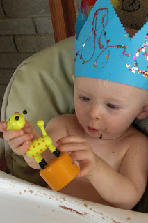 Finn enjoyed his party. His friend Ella presented him with this birthday crown: After he figured out what to do with his cupcake, he seemed to like (playing with) it. Finally, he was really excited about new toys!